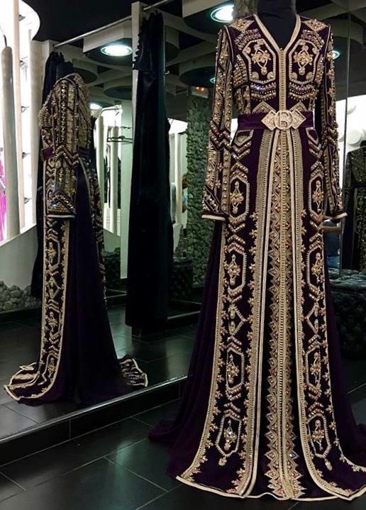 La robe caftan : constitué d’une seule pièce et faite d’un tissu impérativement non transparent, tel que le brocard, le satin duchesse, satin de soie, le velours et le crêpe. Décorée par des broderies florales à la main selon la façon artisanale marocaine et souvent ornée de perles et strass pour donner plus d’allure et brillance. La sfifa (bordure) est un composant essentiel du caftan. Le tout est fini avec une ceinture assortie pour affiner la silhouette de la femme. La robe caftan est plus légère que la takchita et est portée souvent par les jeunes filles et les adolescentes.